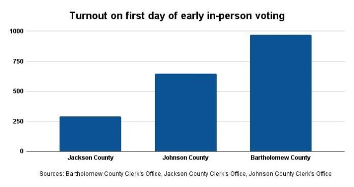 The previous record for turnout in Bartholomew County on the first day of early in-person voting was 728 during the 2020 presidential election. In 2016, just 264 people in the county cast ballots on the first day.