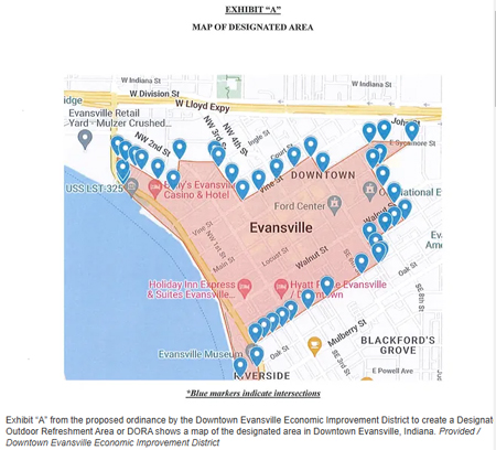 The Downtown Evansville Economic Improvement District filed the ordinance with the city to establish the DORA, which Indiana state law allows a city to create where which residents 21 years of age and older can purchase an alcoholic drink and carry them out of the establishment to drink within boundaries.