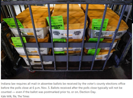 Indiana law requires all mail-in absentee ballots be received by the voter's county elections office before the polls close at 6 p.m. Nov. 5.