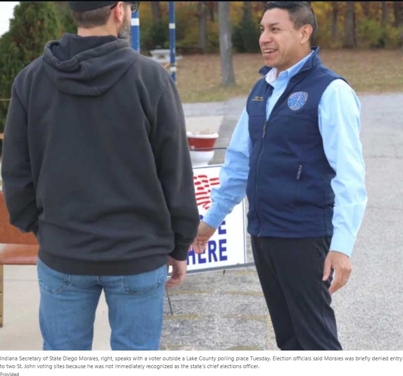 ST. JOHN — Secretary of State Diego Morales was denied entry to two Lake County polling places Tuesday because the Republican was not immediately recognized as Indiana's chief elections officer.
