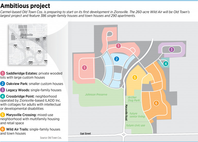Wild Air, a project planned by Carmel-based Old Town Cos., will be built about 2-1/2 miles west of downtown Zionsville on farmland north of the intersection of West Oak Street and Marysville Road. The project will feature 386 single-family houses, some priced up to $3 million; 290 apartments; 15,000 square feet of retail space; a senior-living community; 30 acres of preserved woodland with trails; 10 acres of civic space; and a dog park.