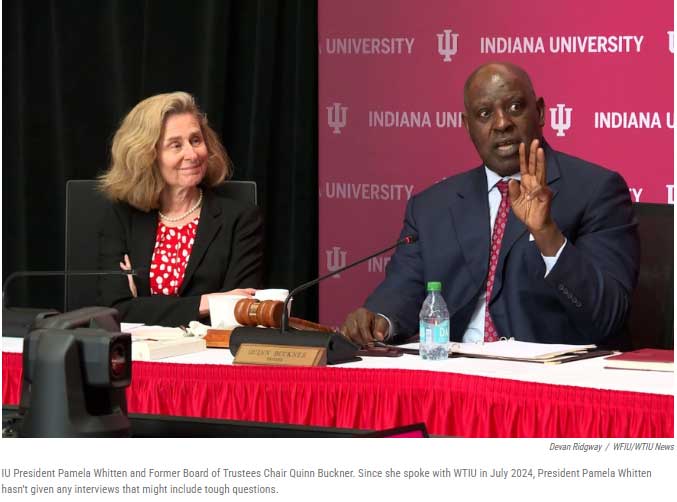 Since she spoke with WTIU in July 2024, President Pamela Whitten hasn’t given any interviews that might include tough questions. Her media appearances have been mainly on industry podcasts and small stations such as WAMW’s Morning Shakeup in Washington, Indiana.