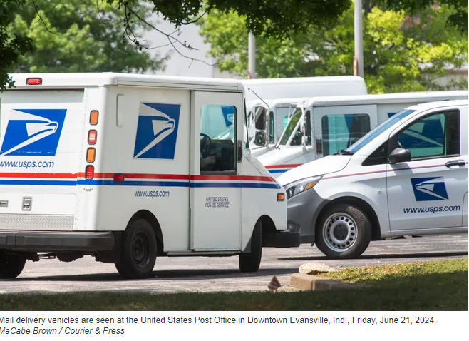 Mail delivery vehicles are seen at the United States Post Office in Downtown Evansville, Ind., Friday, June 21, 2024.