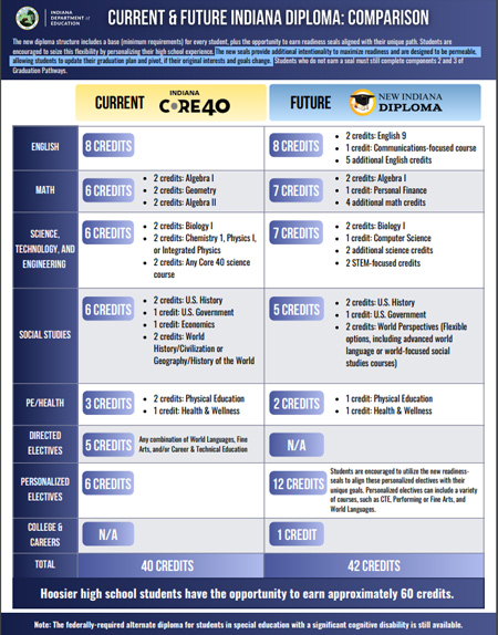 The new diploma requirements are similar to those of the Core 40. However, they require fewer specific courses in each subject area in order to afford flexibility to students in personalizing their coursework, according to state education officials.