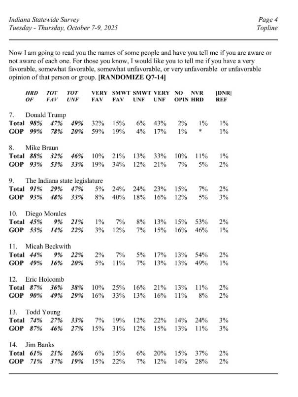 The Indiana Legislature was viewed favorably 29% of all respondents, and 48% by Republicans; Morales was viewed favorably by 9% of all respondents, and 14% by Republicans; Lt. Gov. Micah Beckwith was viewed favorably by 9% of all respondents, and 16% by Republicans; former Gov. Eric Holcomb was viewed favorably by 36% of all respondents, and 49% by Republicans; U.S. Sen. Todd Young was viewed favorably by 27% of all respondents, and 46% by Republicans; and U.S. Sen. Jim Banks was viewed favorably by 21% of all respondents, and 37% by Republicans.