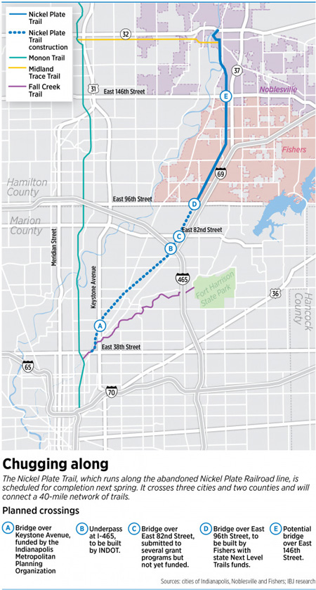 Already, the trail has spurred significant development in Fishers, which has essentially completed its portion of the 17-mile path (it is planning to build one more bridge over a busy intersection). And development is underway as well in Noblesville, which is working to complete its section of the trail.