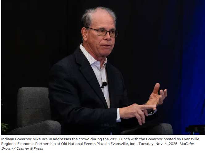 EVANSVILLE — The loudest voices complaining about Indiana's Republican push for redistricting are Democrats whose party has ruthlessly gerrymandered congressional districts elsewhere for years, Gov. Mike Braun said in Evansville Tuesday.