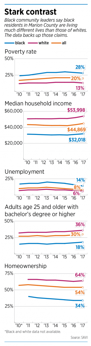 For example, 28% of blacks in Marion County are living in poverty, compared to 13% of whites and 20% of the county overall.