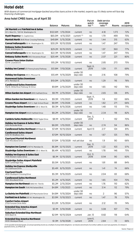 IBJ reviewed records for 34 central Indiana hotels with loans in the form of commercial mortgage-backed securities, or CMBS—a financing method used by about 30% of U.S. hotels—based on public data as of April 30 from research firm Trepp LLC.