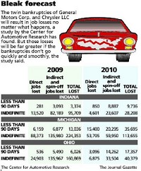 More than 1 million U.S. jobs - and more than 100,000 in Indiana - are riding on whether the bankruptcies of Chrysler LLC and General Motors Corp. are quick and orderly, according to a prominent research center's study.