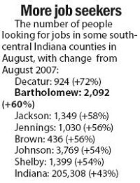 Bartholomew County employed 37,386 in August, down 274 from July, but up 208 from August 2007. The unemployment rate, at 5.3 percent in August, was up from 3.4 percent a year earlier.