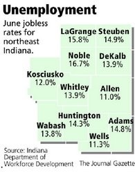 June unemployment rose in the northeast Indiana counties most dependent on auto makers, while it improved in most of those suffering the region's worst unemployment.