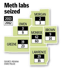 Police reported 62 clandestine meth lab incidents in Monroe County in 2013, making it home to the sixth-most meth lab seizures in the state, according to a recent Indiana State Police Report. The only counties with more meth lab seizures were Elkhart with 63, Allen with 64, Noble with 66, Delaware with 109 and Vanderburgh with 115.