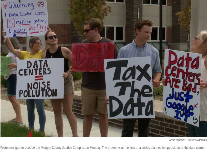 Protesters gathered outside the Morgan County Justice Complex in Martinsville on Monday to voice opposition to a planned data center in Monrovia. About a dozen people held signs with messages like “Farm corn, not data” and “Save our water.”