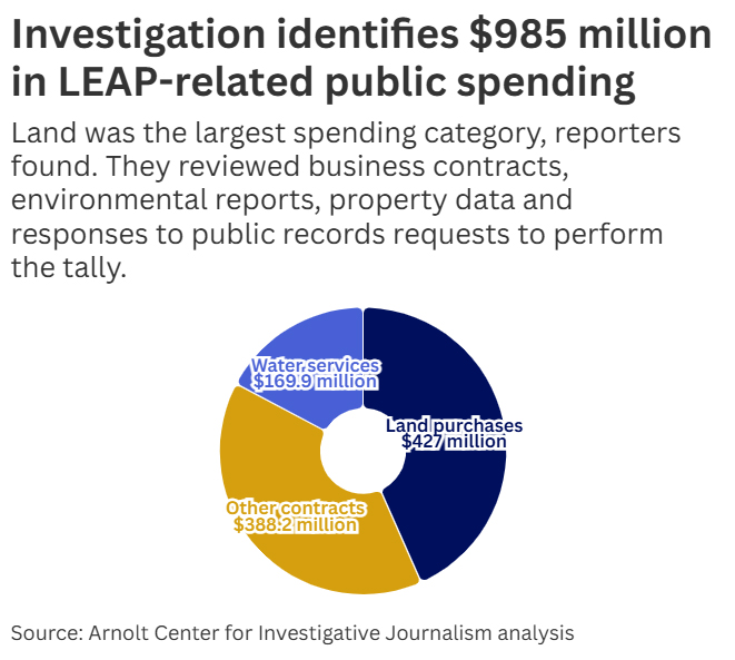 Throughout a six-month investigation, reporters tallied spending on land, water and more — accounting for $985.1 million. They reviewed business contracts across multiple agencies, environmental reports, property data and responses to public records requests, in addition to speaking with public officials.