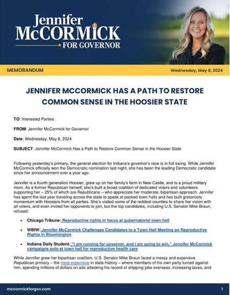 "Hoosiers across the state and across the political aisle are tired of extremism and refuse to turn Indiana over to the extremism and chaos that Mike Braun represents," McCormick said. "Hoosier values reflect those of common sense, civility and bipartisanship. Let's bring this back to our great state."
