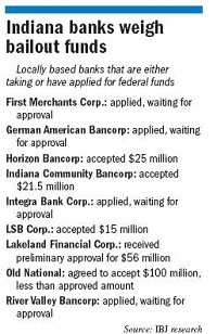 Other banks lining up for federal funds: Horizon Bancorp of Michigan City has agreed to accept $25 million; LSB Financial Corp. of Lafayette accepted $15 million; Columbus-based Indiana Community Bancorp, a subsidiary of Indiana Bank and Trust, accepted $21.5 million. Other banks, including Jasper-based German American Bancorp Inc., Evansville-based Integra Bank Corp. and Madison-based River Valley Bancorp, have applied and are waiting for word.