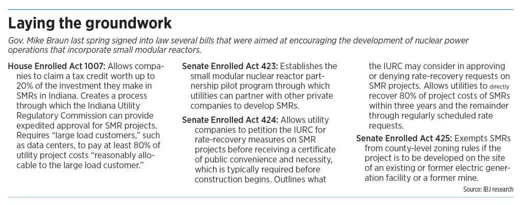 At the core of the legislative package were Senate Bill 424 and House Bill 1007, which Gov. Mike Braun signed into law. The laws offer energy companies a 20% tax credit for costs related to developing SMRs. Another key provision allows utilities to recover 80% of the costs for approved SMR projects within three years through direct rate increases. The remaining 20% can be recovered through general rate increase requests.