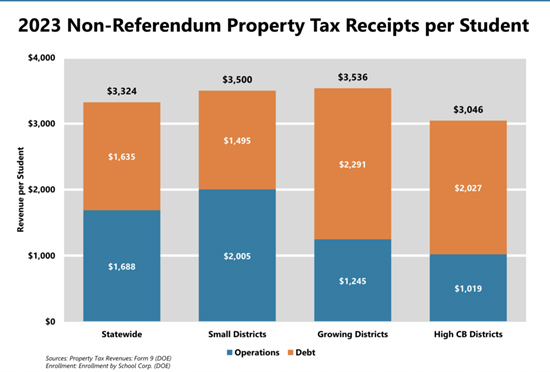 “Small districts do a little better … in their operations funds, so you can see their bar for debt decreases. Growing districts receive quite a bit less than the statewide figures, so they make up the gap with debt,” said Scott Bowling, executive director for the Indiana Association of School Business Officials.