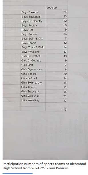 One disparity the audit said is the number of girls participating in sports to boys at Richmond High School, as the 2024-25 school year had 250 boys and 169 girls, adding that an additional 54 girls are needed to be participating in order to be proportionate with the school's enrollment.