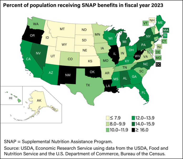 USDA research from fiscal year 2023 showed Indiana is among the lowest states in the percent of population receiving SNAP – between 8 and 10%. In comparison, six states and Washington D.C. were above 16% and all of Indiana’s neighbors rank higher.