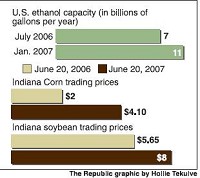 The price of corn in Indiana has roughly doubled in the last year, a trend agriculture experts attribute to increased demand due to ethanol production. Corn was trading at $4.10 per bushel last week, up from $2 per bushel on June 20, 2006, said Gary Fischer, grain merchandiser at Premier Ag.