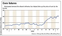 The ethanol gold rush sweeping Indiana and other states that grow its prime ingredient, corn, is threatening profit margins for livestock producers and portends higher prices at the supermarket. Perhaps no sector is more nervous these days than pork, where Indiana ranks fifth in production nationally. "Much higher feed costs are likely to eliminate the profit potential for pork production in 2007," Chris Hurt, a Purdue University agriculture economics professor, said in his recent market outlook report. Corn, the primary feed for hogs, has risen more than 65 percent in the last year, topping $4 a bushel. A big reason is speculation over the corn needs of 75 U.S. ethanol distilleries announced or under construction. At the Indiana Pork annual meeting Jan. 30, an Iowa State University professor of economics warned corn prices could rise 40 percent, noting that demand for corn for ethanol is expected to double to 4 billion bushels next year. "That was a shock to us," said the professor, Dermot Hayes, noting that the total U.S. corn harvest last year was almost 11 billion bushels. Pork producers used about 1.1 billion bushels as feed. Just a 25-percent increase in corn prices costs the pork industry $200 million a month, Hayes said. By some estimates, demand from the ethanol industry could soar to 8 billion bushels as the distilleries go online. About 20 of those are slated for Indiana, where two ethanol plants already are operating. While the leftover grain in ethanol production can be used as animal feed, this socalled distiller's grain is more problematic to use for hogs than in poultry and beef, because of nutritional deficiencies and incompatibility with feeding systems. The biggest single cost for pork producers is feed, said Mike Platt, executive director of Indiana Pork, a trade and lobbying group. One silver lining is that some pork producers, like David Hardin of Danville, also grow their own corn. For farmers who don't, rising corn prices have an immediate effect on their bottom line, Hardin said. Fortunately, for the moment, "hog prices have stayed at high levels." Also, the pain could be eased if a lot more corn is grown in the next few years. Still, "it's something that we're going to have to deal with," Hardin said. "There's been a paradigm change, a whole new use for what is our primary feedstock." Many in the pork industry say it's an unintended consequence of Gov. Mitch Daniels' push to position Indiana at the center of the burgeoning ethanol industry. To the applause of Indiana's corn farmers, the state has pledged incentives worth more than $10 million, not to mention a tax credit of 12.5 cents per gallon of ethanol they produce, to lure new plants. The federal government already provides a 52-cent tax credit for every gallon of pure ethanol that plants refine. But the heightened demand for corn nationwide has squeezed some of the 3,000 pork operations in Indiana, where pork is a $3 billion industry. "It's no secret that growth in ethanol is putting significant pressure on corn prices," Indiana Agriculture Secretary Andy Miller told pork producers meeting at the Indiana Farm Bureau downtown. Miller said Daniels also wants the state to lead the way in developing ethanol from grasses and other so-called cellulosic, non-food sources. "We can't solve this nation's energy prices on the back of corn" alone, Miller added. Daniels' team is backing House Bill 1548, introduced by state Rep. Dan Stevenson, D-Hammond, which would set aside $20 million in credits for cellulosic ethanol production. Cellulose to the rescue? Purdue University has been on the cutting edge of trying to make ethanol production cost-effective from common plants not used for food. Almost two years ago, it developed a strain of genetically altered yeast that allows 40 percent more ethanol to be made from sugars found in things like cornstalks and wheat straw. Purdue licensed the technology to Canadian company Iogen Corp., which is trying to build plants competitive with those milling corn. But Purdue researchers are still trying to improve the efficiency of the yeast, said Nancy Ho, a senior research scientist at Purdue and one of the nation's top researchers in the field. Ho, who sat near first lady Laura Bush during President Bush's State of the Union address last month, said it should be a couple of years before the cellulosic process is cost-competitive. Bush has called for greater use of ethanol, which is used as an additive to help gasoline burn cleaner and as a virtual alternative to gasoline as E85-an 85-percent ethanol/15-percent gasoline blend that can be burned by millions of vehicles. "For policymakers, it is most important to realize that there are many positive advantages of using corn for bio fuel ... but there are unintended negative consequences in other sectors," Hurt said. For now, corn farmers are smiling ear to ear. "Ethanol is the mistress of the corn industry," said Christopher Novak, executive director of the Indiana Soybean Alliance, who also represents the Indiana Corn Growers Association. "And yet the wife-we recognize the wife is there ... and the wife is the livestock industry," Novak told pork producers. But, he added: "We won't cast the mistress aside, unfortunately. Ethanol is here to stay." Novak said the rise in corn prices amounts to a "period of change and transition, but the market will stabilize." He noted that there is no corn shortage in Indiana. Rather, the overall market for corn is being bid up on ethanol speculation. He said farmers will find a way to plant more corn and that there are 40 million acres in reserve land set aside by the federal government. Couple that with biotechnology advances that improve yields and new research to make distiller's grains more palatable for hogs, he said. If farmers don't dramatically increase corn yields this year, the country could face a corn shortage in 2008, thanks to demand for ethanol, Hayes said. Corn supply already is growi