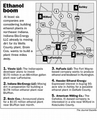 Their outlooks on the industry differ, but Indiana Bio-Energy LLC and Broin Companies each plan to invest more than $100 million to build ethanol plants in Wells County. Only three miles would separate the two plants southwest of downtown Bluffton. With the competition so close, each company recognizes it will need to be as efficient as possible to succeed in an industry projected to be increasingly cutthroat.