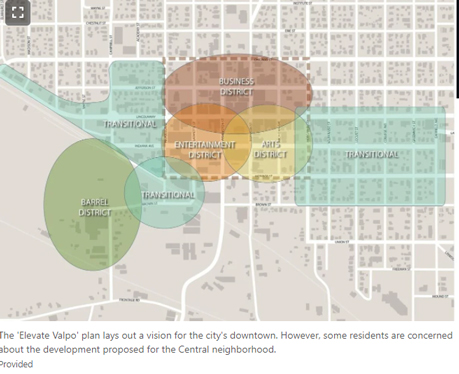 Released in February, 'Elevate Valpo' hopes to lay out a road map for future development in the city. The plan identifies several areas of focus, including a broad range of housing in the downtown core. The plan states that "Valparaiso's burgeoning retail base and culinary district will hinge on critical mass of people living downtown."