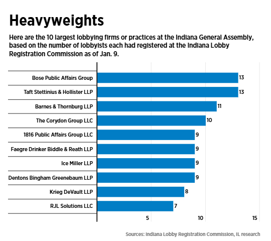 As of Jan. 9, each of those firms had 13 lobbyists registered to work with the Legislature, according to Indiana Lawyer’s review of forms filed with the Indiana Lobby Registration Commission.