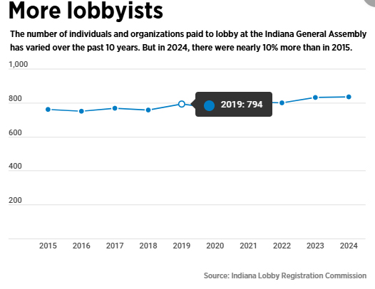 The number of individuals and organizations paid to lobby at the Statehouse also has increased nearly 10% over the past decade, to 833 in 2024. The final tally for 2025 won’t be known until later in the year.