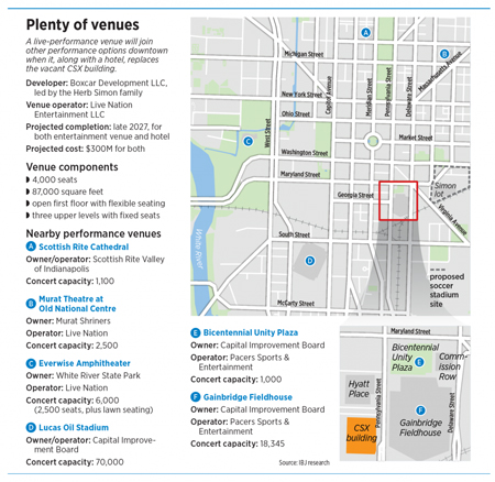 Phil Bayt, an Ice Miller LLP attorney who represents the Simons on the project, said the family became open to the idea of incorporating an entertainment venue into its project after it learned Live Nation was considering a project of its own. The Simons decided then to scrap the apartment portion of the CSX-site project in favor of a focus on entertainment.