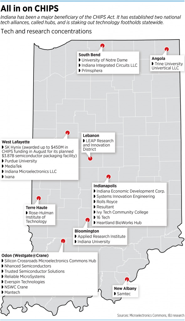Since the CHIPS and Science Act became law in 2022, the federal government has pledged hundreds of millions of dollars for emerging-technology research and production in Indiana that is meant to boost national security and broaden U.S. innovation.
