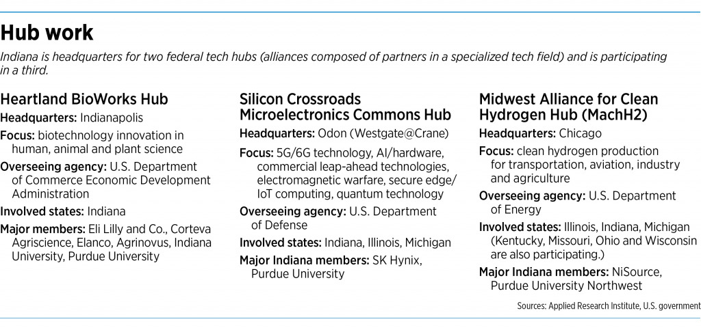 Indiana’s two CHIPS-Act-funded hubs would likely lose steam, as well. A tech hub is a collection of members in the private sector, academia and government who are collaborating to grow innovation and domestic production in microelectronics and the life sciences. The state and hub organizers are seeking to grow on-the-ground investments around current and future members.